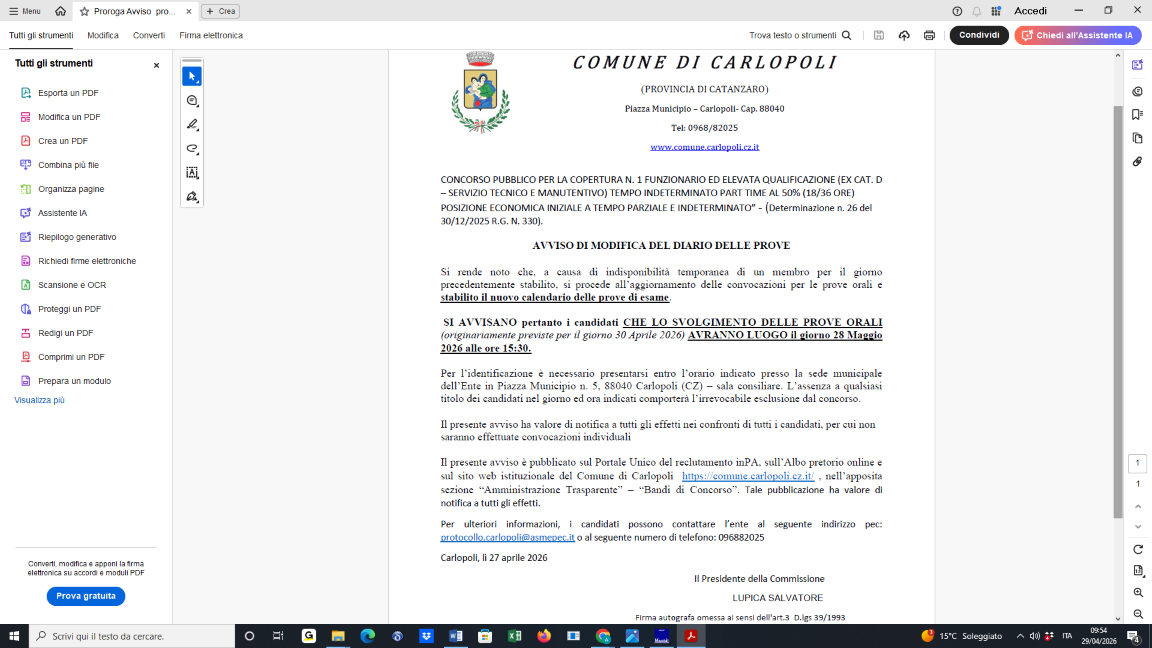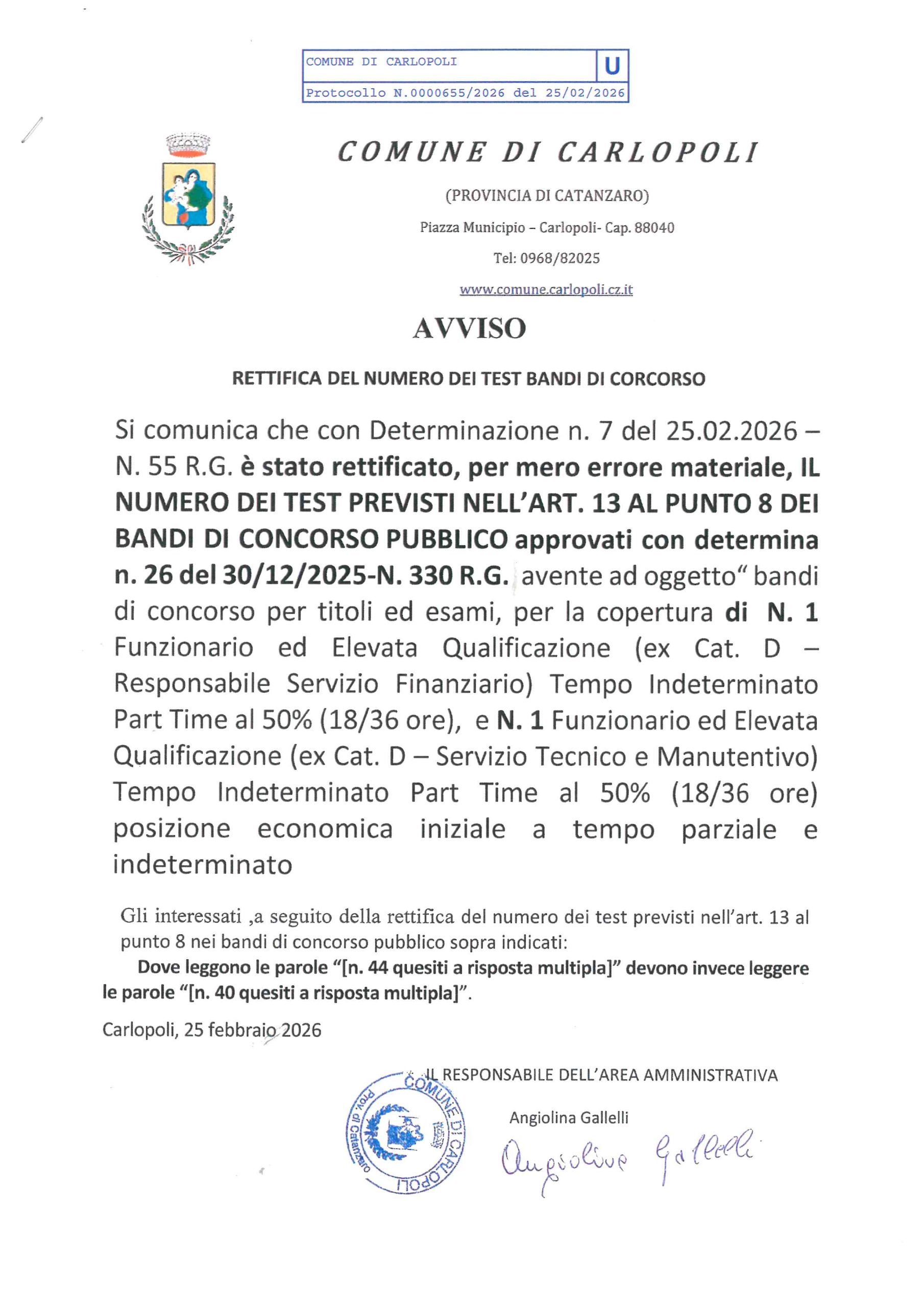 Rettifica in autotutela relativa ad un errore materiale nel numero dei test indicati nei bandi di concorso pubblico approvati con determina n. 26 del 30/12/2025-N. 330 R.G. avente ad oggetto“ bandi di concorso per titoli ed esami"